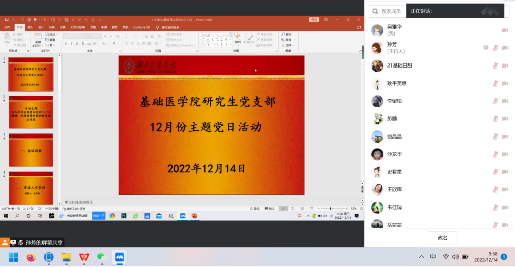 本网讯(通讯员 吴雅华)12月14日下午,太阳tyc33455研究生党支部开展了12月份主题党日活动。本次活动的主题是“深入学习宣传贯彻党的二十大精神,统筹疫情防控和经济社会发展”。研究生党支部全体党员参加活动,活动由党支部副书记孙芳同志主持。